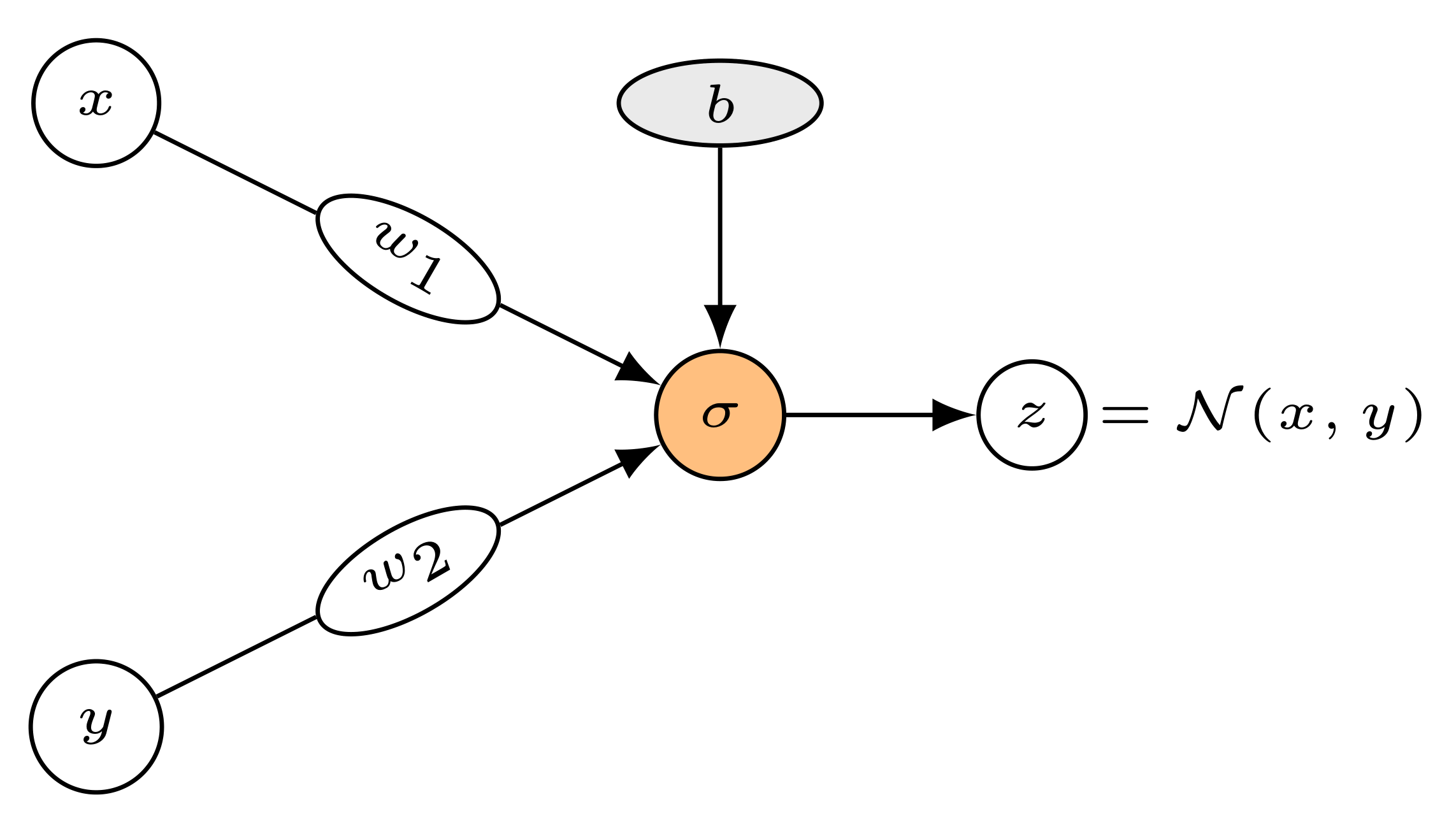 Unraveling what this diagram encodes, we find that \(\mathcal{N}(x,y) = \sigma(w_1 x + w_2 y +b ).\) It is a function of \(x\) and \(y\) as well as of \(w_1\), \(w_2\), and \(b\). So by holding all other variables constant, we can compute partial derivatives. For instance:
