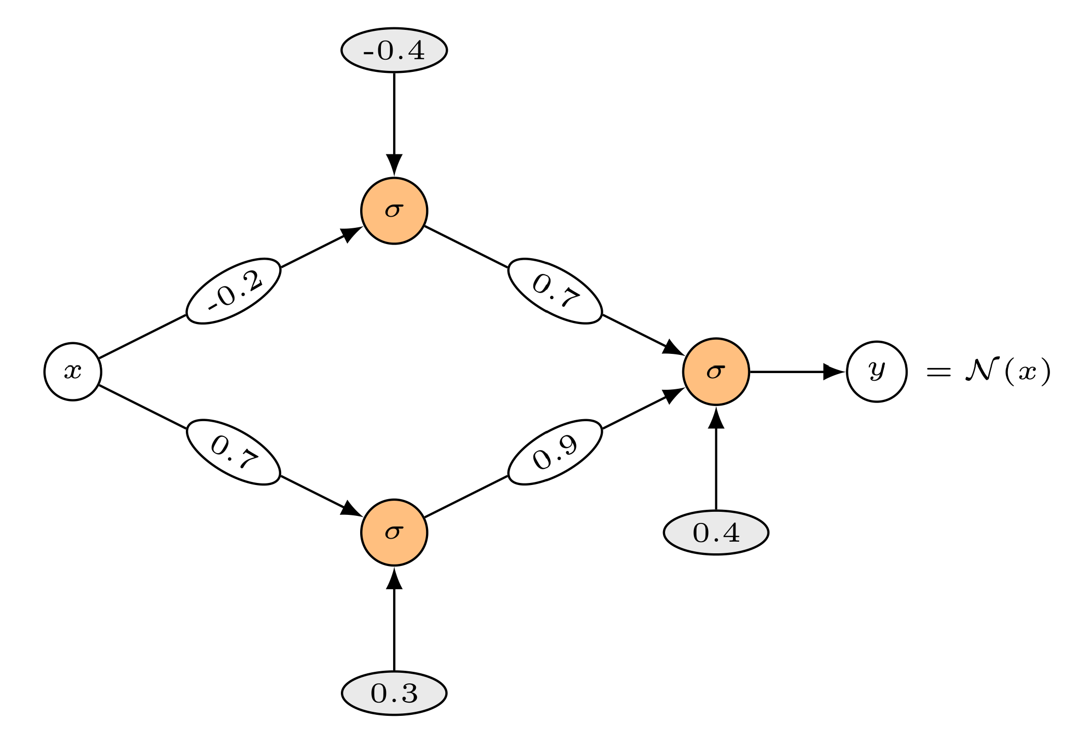 Consider the neural network in Figure 1 with weights and biases as indicated and assume that all of its neurons use the ReLU activation function. The neural network itself is a function \(\mathcal{N}(x)\) of the single variable \(x\):